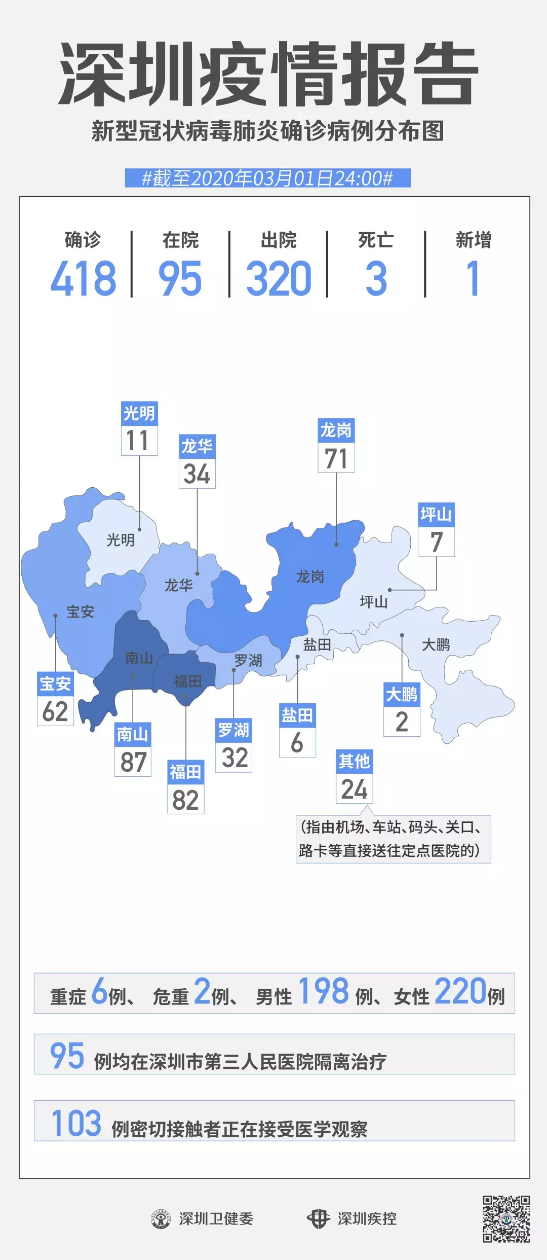 截至3月1日24時,深圳累計報告“新冠肺炎”確診病例418例。3月1日當天全市新增確診病例1例,當天出院病例12例(從2月26日起不再公布出院個案)。 ▲新增出院病例已超過新增確診病例 累計報告確診病例中,男性198例、女性220例。 按照病例管理地區劃分,南山區87例、福田區82例、龍崗區71例、寶安區62例、龍華區34例、羅湖區32例、光明區11例、坪山區7例、鹽田區6例、大鵬新區2例、其他(指由機場、車站、碼頭、關口、路卡等直接送往定點醫院的)24例。 目前,重癥6例、危重癥2例,死亡3例,累計出院320例。 95例確診病例均在深圳市第三人民醫院隔離治療。 103密切接觸者正在接受醫學觀察。 資料來源:深圳市疾控中心、深圳市衛健委、廣東省衛健委