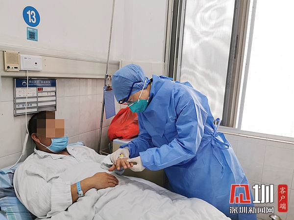 剛剛看到檢測(cè)結(jié)果,鄺醫(yī)生便迅速穿上防護(hù)服,進(jìn)入隔離區(qū)跟患者進(jìn)行了面對(duì)面的溝通交流。那位患者得知自己檢測(cè)的結(jié)果后略顯失落,嘆了一口氣,似乎是擔(dān)心焦慮等待了多日,心里的石頭終于落了地。他說(shuō):“我一定聽您的話,好好吃藥,好好治療,爭(zhēng)取活著回來(lái)。”