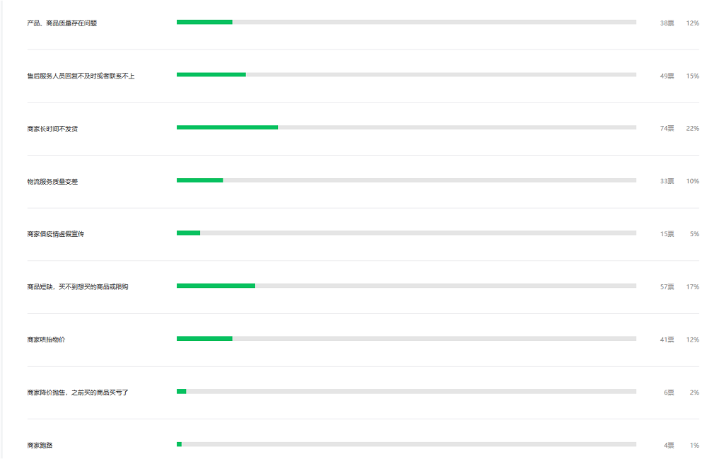 不少市民表示,疫情期間“在線消費”遇到過問題。其中,長時間不發貨、因商品短缺或限購買不到商品、售后服務人員回復不及時或聯系不上位列市民消費不滿意榜前三;而商品質量存在問題、商家哄抬物價則并列消費不滿意榜第四。