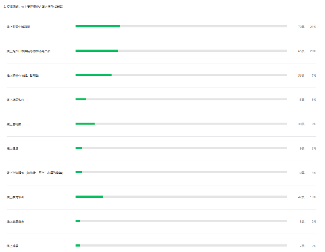 雖然有56%的市民表示對“在線消費”的商品質量和服務評價滿意度下降,但是市民的原有生活習慣卻在潛移默化中改變了,超一半的市民表示喜歡“在線消費”,疫情結束后,會提高“在線消費”在日常開銷中的比例。特別是會加強生鮮蔬菜、口罩酒精、化妝日用品的購買頻率,也會更常使用網絡進行教育培訓、就醫購藥、法律咨詢、看房看車等。