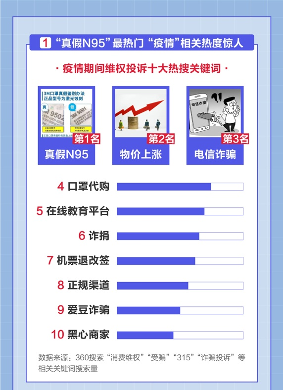 深圳商報2020年3月15日訊 360搜索、360瀏覽器今日發布《315消費者維權數據報告》(以下簡稱《報告》)。報告顯示,“真假N95”、“口罩代購”等與口罩質量相關的訊息成熱議話題。
