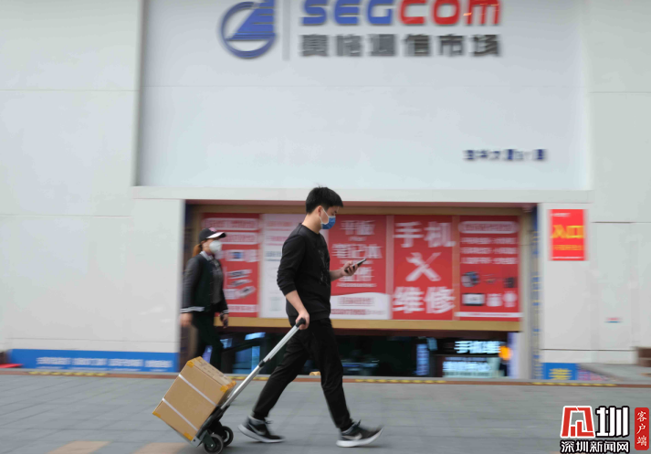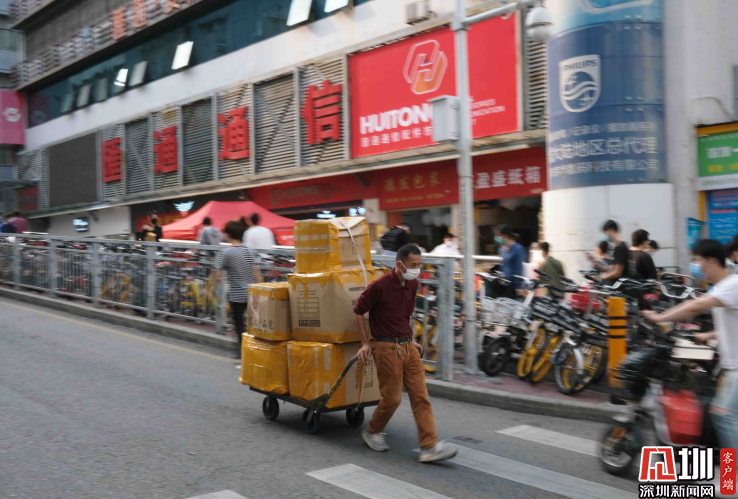 3月16日下午,賽格通訊市場門口,一名拉著小推車的人經過。