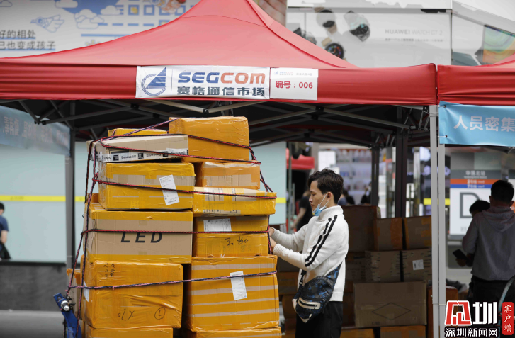 華強北步行街的臨時帳篷旁邊,一位從業者正在整理貨物。