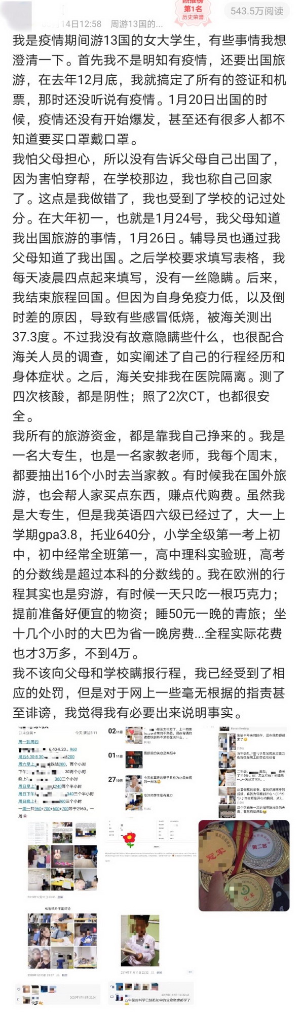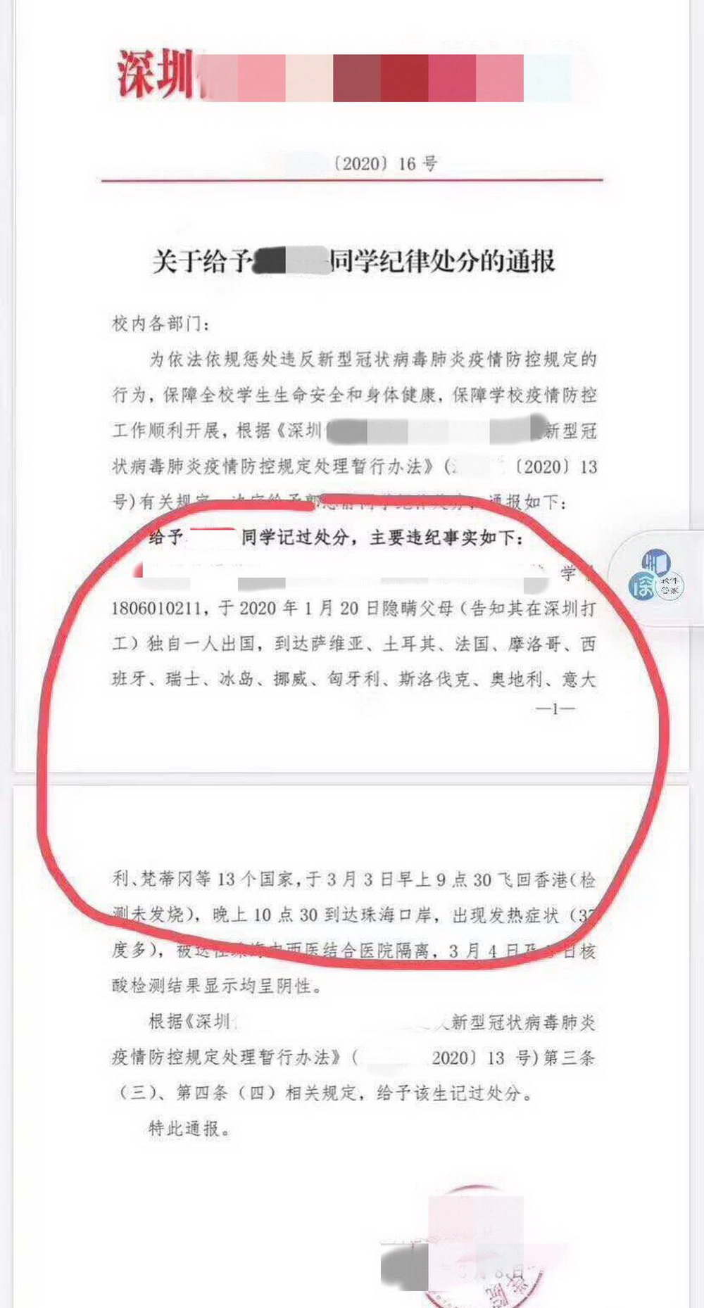 記者從小Y處了解到,1月20日,她出發(fā)開(kāi)始旅行并于3月3日從珠海入境回國(guó),期間共游玩13個(gè)國(guó)家。“10月份就已經(jīng)決定出去玩,11月一直在準(zhǔn)備簽證,12月中旬簽證什么的都已經(jīng)準(zhǔn)備好了。”由于害怕父母擔(dān)心她一人在外旅行的安全問(wèn)題,出發(fā)時(shí)并沒(méi)有告知父母。“1月23日,學(xué)校要求所有學(xué)生填寫(xiě)一個(gè)假期所在地,我填寫(xiě)的是‘在家’,因?yàn)椴幌胱尲依锶酥牢以趪?guó)外,害怕穿幫。出發(fā)時(shí)國(guó)內(nèi)疫情還沒(méi)有爆發(fā),所以不是很清楚國(guó)內(nèi)的疫情,也沒(méi)想到填這個(gè)信息是為了防控疫情所用,所以沒(méi)有如實(shí)填寫(xiě)。大年初一,也就是1月24日,我父母知道了我出國(guó)的事,對(duì)我嚴(yán)厲批評(píng)。之后學(xué)校要求填寫(xiě)表格,我沒(méi)有隱瞞,都是如實(shí)填寫(xiě)。”