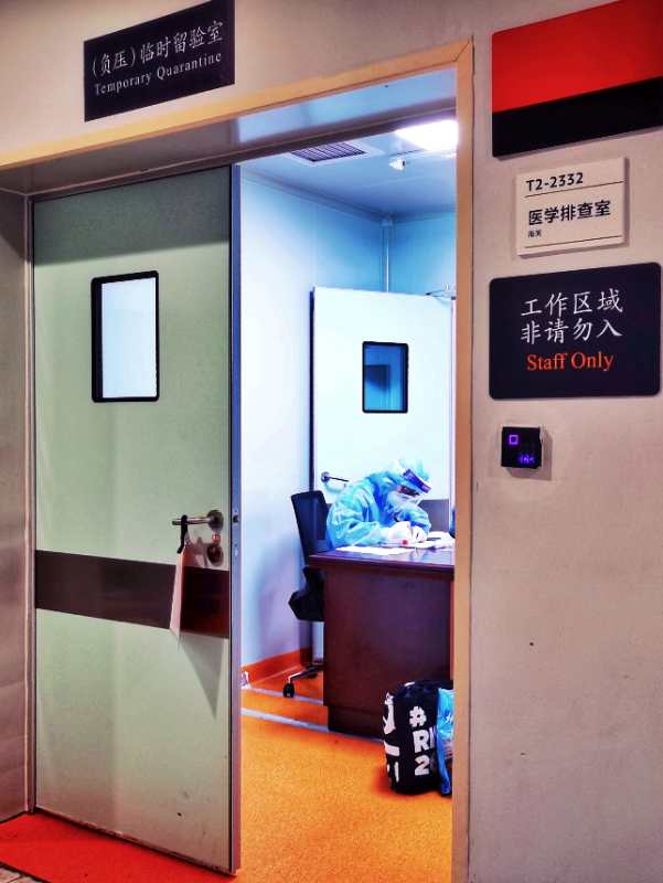 因為我有輕微鼻炎、中耳炎,主動申報后被單獨帶走詢問流行病學史,并做鼻、咽拭子檢測。檢測的時候跟醫生聊天,他們說他們有好幾班醫生要24小時輪守。棉球棒取出時沾著點血,醫生說可能是黏膜太干燥了,不用擔心,我說應該是,我大概15個小時沒喝水了。但我想防護服下的他大概也很久不能喝水。