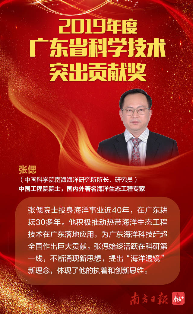 其中,2019年度廣東省科學技術突出貢獻獎的獲獎者分別為:中國工程院院士、亞太材料科學院院士、華南理工大學教授王迎軍;中國工程院院士,國內外著名海洋生態(tài)工程專家,中科院南海海洋研究所所長、研究員張偲。