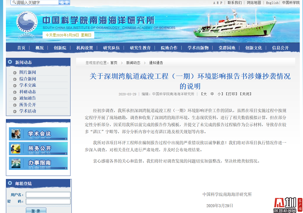 見圳客戶端·深圳新聞網2020年3月29日(見圳客戶端、深圳新聞網記者 鐘鴻冰)3月29日,中國科學院南海海洋研究所在官網發布說明稱:深圳灣航道疏浚工程(一期)環境影響評價工作雖按規定進行了現場踏勘,調查并收集了有關資料等環節,但因采用其以前的報告作為模板,并將未完成的報告作為公示材料,導致公示的環評報告中出現多處錯誤。南海海洋研究所表示,將對相關責任人嚴肅處理并公示處理結果。