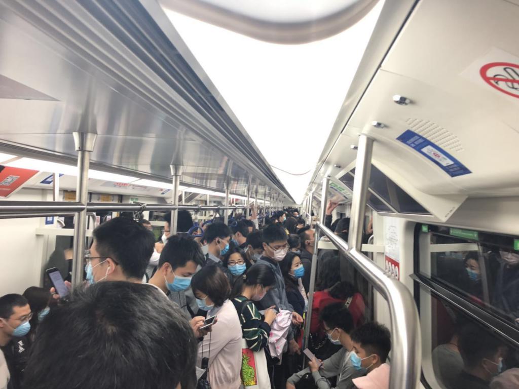 7點30分,深晚另一路記者從五號線長龍站進站,進站較順利沒有排長隊,但是車上較擁擠,沒有座位。到達深圳北站后,在轉4號線去民樂站時排起了長隊,大概等了13分鐘,才勉強擠進4號線,車上幾乎沒有空間,身體無法動彈。8點17分從民樂出站,連同排隊等車,9站地鐵一共用時近50分鐘。