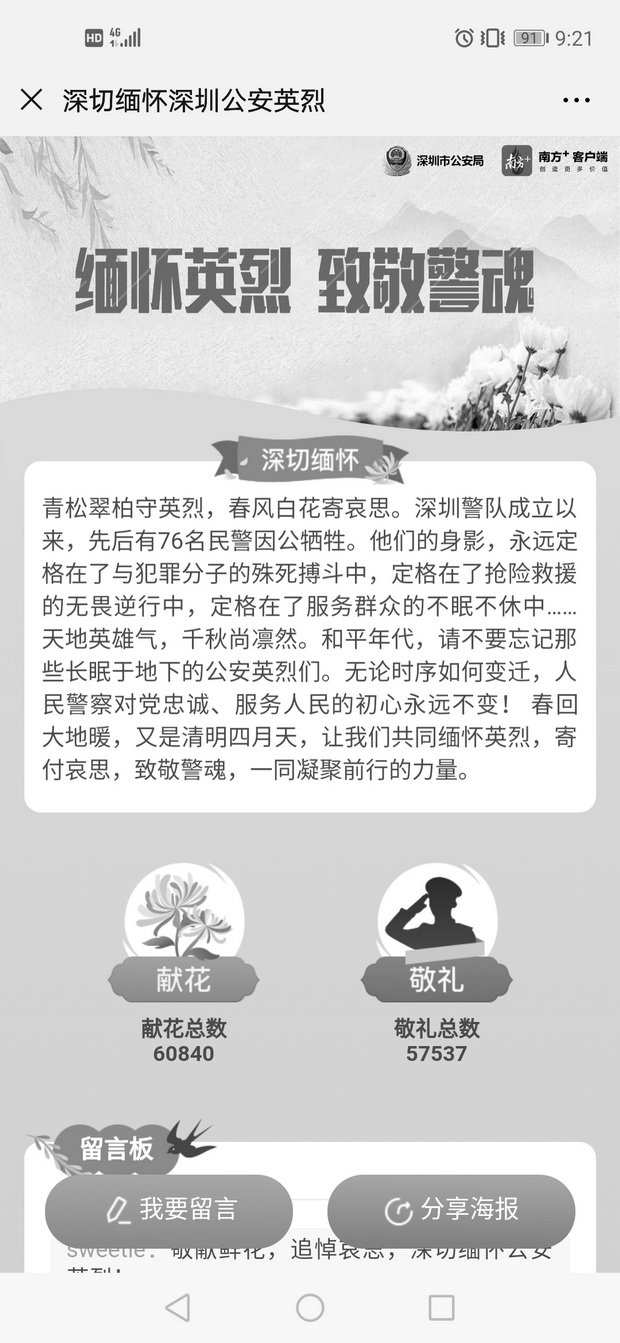 據介紹,鑒于當前疫情防控形勢,市公安局不組織集體祭掃活動,通過公安內網、互聯網等網絡開設“緬懷英烈”專欄開展“網上祭掃”活動,市民群眾可點擊深圳公安微信公眾號,向公安英烈獻花、留言,寄托哀思,致敬警魂。
