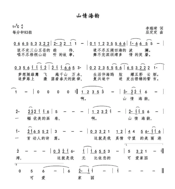 《山情海韻》歌詞大氣,飽含深情。作者以詩一般的語言為我們描繪了一幅幅優美多姿的畫面,詮釋了深圳從一個小漁村發展成繁華大都市的壯闊景象,展現了年輕一代充滿活力、努力奮斗、只爭朝夕的精神面貌,催人奮進。