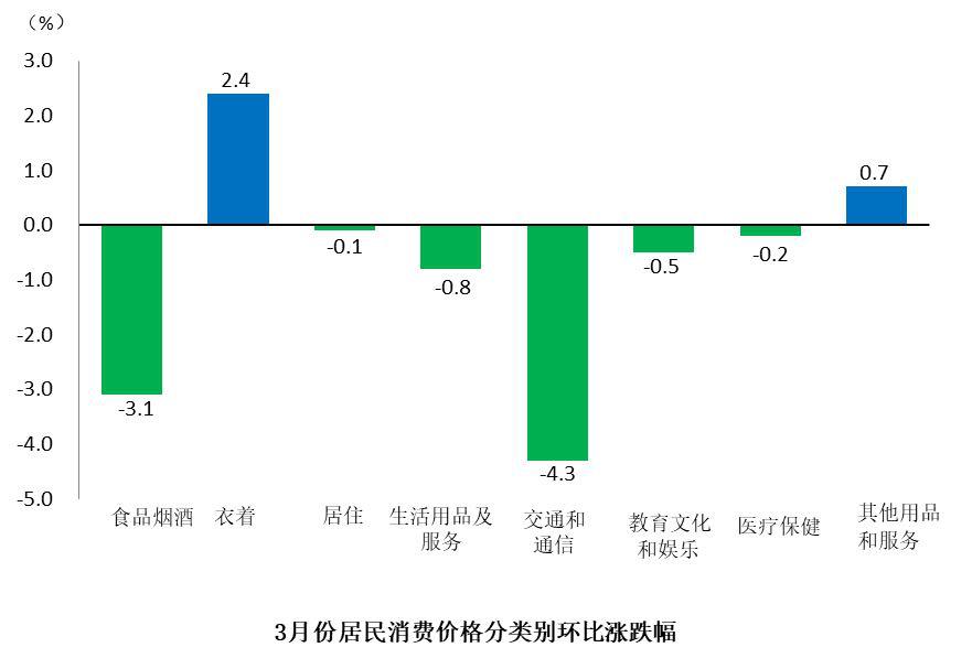 總體來看,食品價格環比下降4.3%,非食品價格環比下降0.7%;服務價格環比下降0.9%,消費品價格環比下降1.9%。