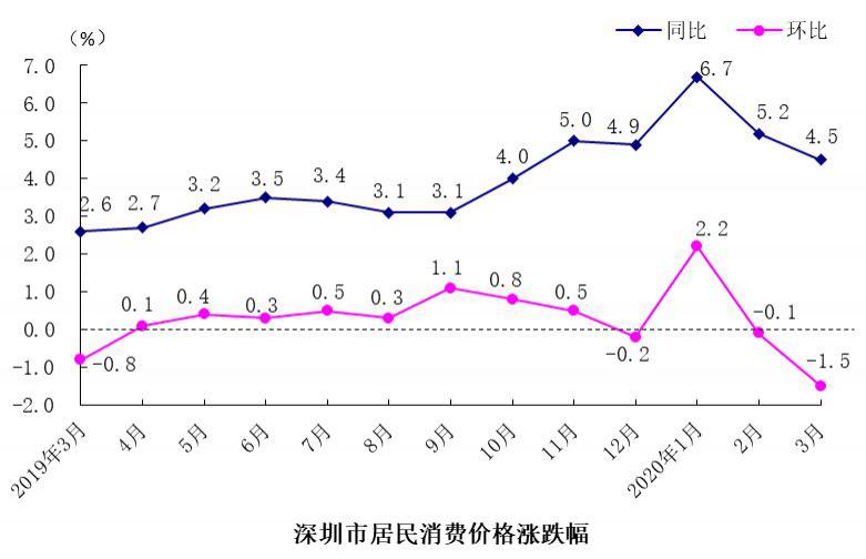 深圳特區報2020年4月12日訊 4月12日,國家統計局深圳調查隊發布最新統計數據,3月份,深圳居民消費價格(CPI)環比下降1.5 %,降幅比上月擴大1.4個百分點;CPI同比上漲4.5%,漲幅比上月收窄0.7個百分點。
