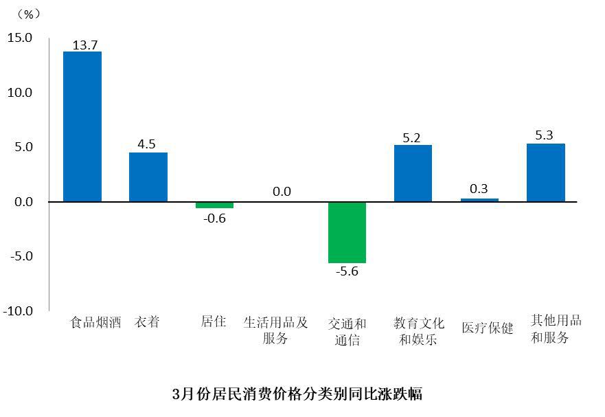八大類商品和服務同比價格五升二降一平,食品煙酒價格上漲13.7%,其他用品和服務價格上漲5.3%,教育文化和娛樂價格上漲5.2%,衣著價格上漲4.5%,醫療保健價格上漲0.3%;交通和通信價格下降5.6%,居住價格下降0.6%;生活用品及服務價格持平。