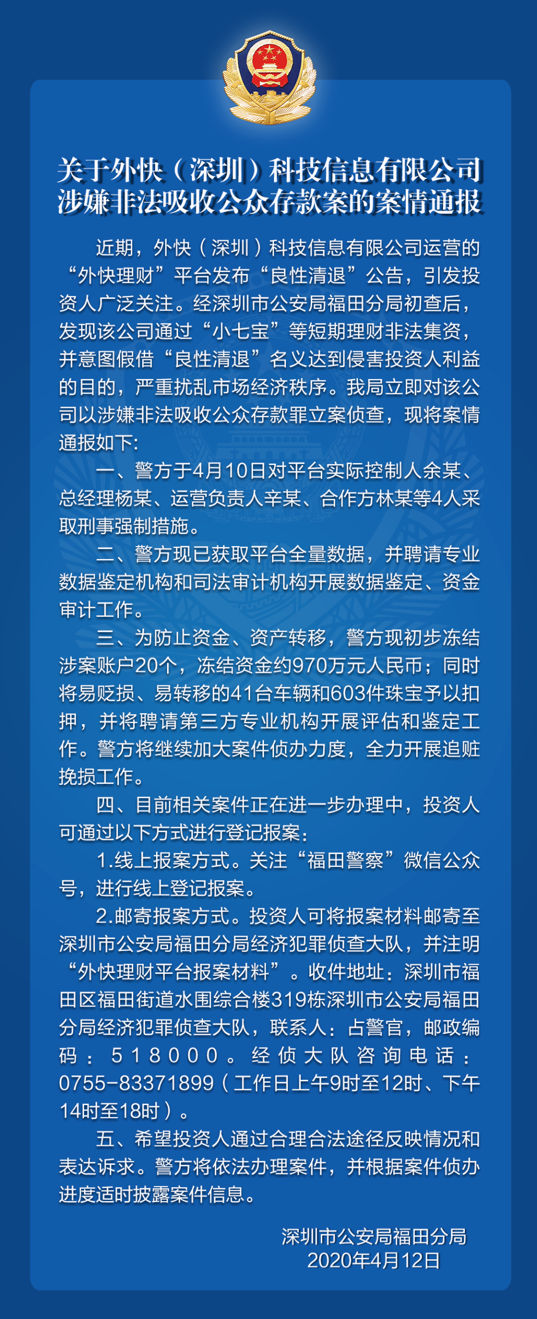關于外快(深圳)科技信息有限公司涉嫌非法吸收公眾存款案的案情通報