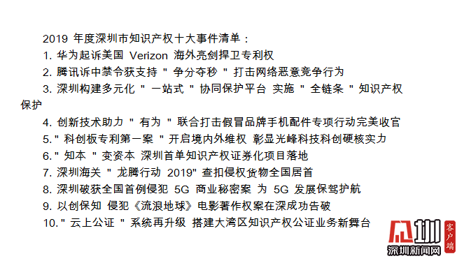 值得關注的是,在深圳市知識產(chǎn)權(quán)工作會議期間,全市2019年度知識產(chǎn)權(quán)十大事件正式對外發(fā)布,華為起訴美國Verizon、騰訊訴中禁令獲支持、“有為”聯(lián)合打擊假冒品牌手機配件專項行動完美收官等事件上榜。