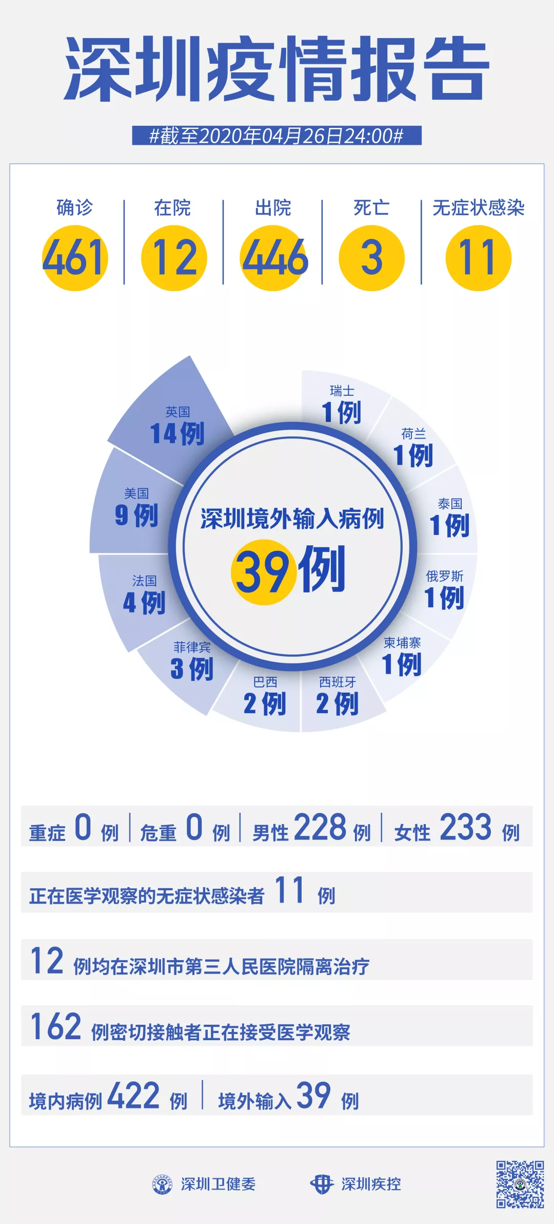 截至4月26日24時,深圳累計報告新冠肺炎病例461例。