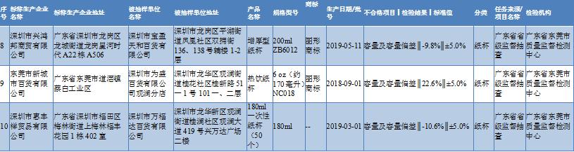 通告顯示,深圳抽檢的3批不合格樣品分別為深圳市寶盈天和百貨有限公司銷售的增厚型紙杯、為盛百貨有限公司觀瀾分店銷售的熱飲紙杯和萬福達百貨有限公司銷售的180ml一次性紙杯(50個),不合格項目均為容量及容量偏差不符合食品相關產品安全國家標準規定。