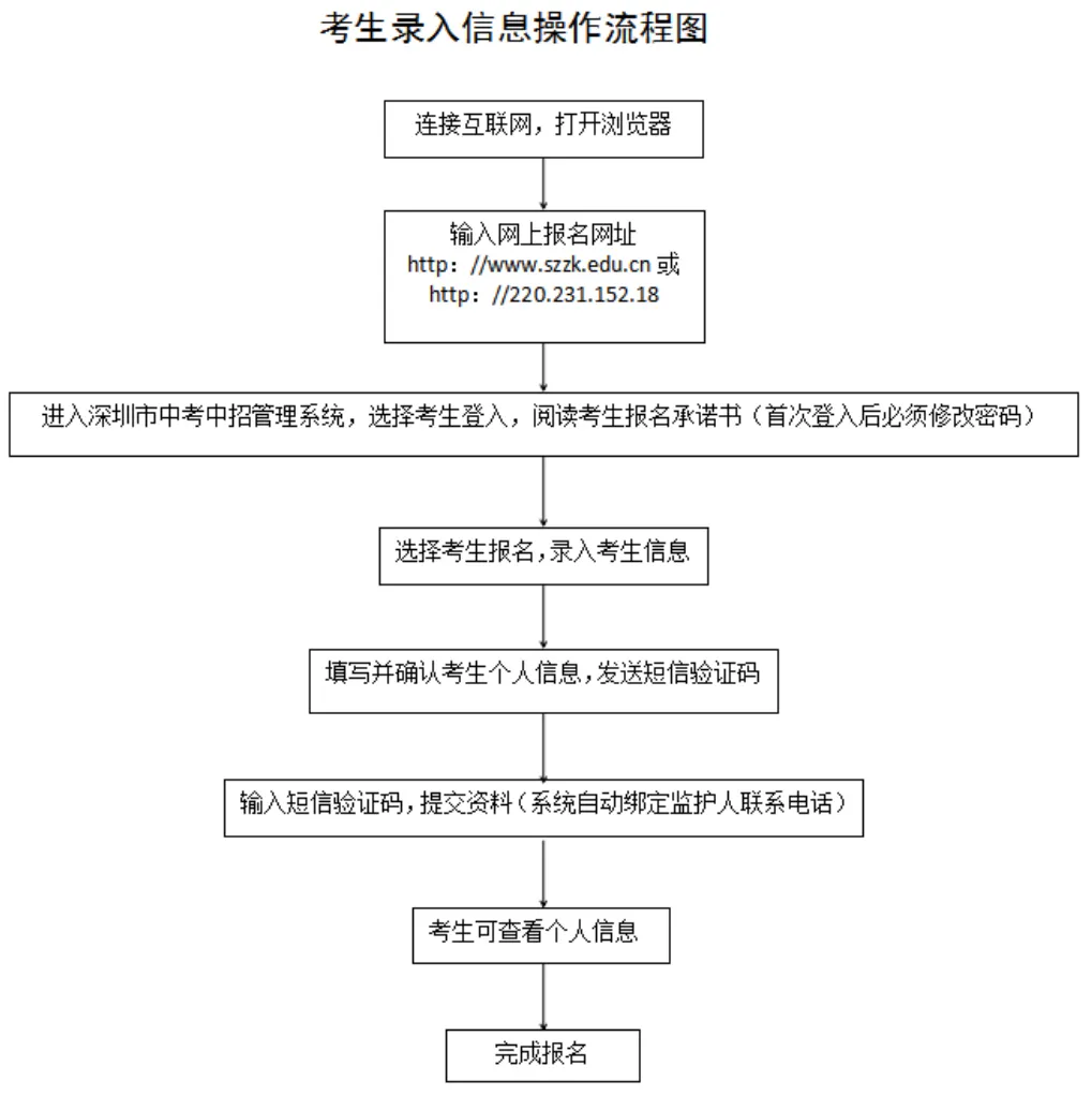 見圳客戶端·深圳新聞網2020年4月30日訊 據深圳市教育局消息,2020年深圳高中階段學校招生考試(以下簡稱“中考”)報名定于5月6日-15日進行,考試時間為7月20日-21日。 今年本市應屆初中畢業生仍繼續在就讀學校集體辦理報名手續。符合深圳中考報名條件的深圳戶籍往屆生、在市外就讀的深圳戶籍應屆初中畢業生(以下簡稱“社會類考生”)采用網上報名方式進行報名。 報名條件 一、具有我市戶籍的初中畢業生,可以在我市報名參加中考。 二、具有我市初三學籍的隨遷子女可以報名參加中考,同時符合以下條件的,可以參加相應的公辦普高、民辦普高和中職學校的劃線錄取。 (一)父親或母親在我市具有合法穩定職業; (二)父親或母親在我市具有合法穩定住所; (三)父親或母親持有有效《深圳經濟特區居住證》; (四)父親或母親在我市繳納基本養老保險及基本醫療保險,且至少其中一個險種累計繳費滿3年,社保累計年限計算截至2020年8月31日; (五)隨遷子女在我市具有3年完整初中學籍。 不符合上述條件但具有我市初中學籍的隨遷子女,可以在我市參加中考,但僅限于參加民辦普高補錄或中職學校注冊入學。 三、高中階段學校在校生不得報名。 本市應屆初中畢業生報名辦法 本市應屆初中畢業生于5月6日至7日在就讀學校集體辦理報名手續。 今年中考繼續實行網上報名。要求各學校開放計算機房,為本校考生上網報名提供方便。 5月8日至15日,學校組織考生進行電子攝像,學校和考生分別上網錄入報名信息,考生錄入信息可參考“考生錄入信息流程圖”進行操作。 市教育局強調,學校不得以任何理由拒絕有本校學籍的應屆畢業生報考(參加中職學校自主招生、注冊入學的考生,也須報名參加中考)。如有違反者,將嚴肅查處,并追究相關人員責任。同時要求各區有關職能部門、各有關學校(報名點)要嚴格審查報名材料。對不符合報名條件、弄虛作假而被錄取的考生,一經發現,取消其錄取資格;已經到錄取學校報到注冊的,取消其學籍,并追究相關人員責任。 社會類考生報名辦法 社會類考生采用網上報名方式進行報名。報名考生需在5月6日至15日登錄報名網址(http://www.szzk.edu.cn/),按照提示進行網上注冊,上傳報名審核資料,由考生戶籍所在區社會報名點進行線上審核,審核通過后系統將生成中考考生號及初始密碼,考生需用獲取的考號及密碼登錄中考中招管理系統,填寫個人信息,具體操作可參考“考生錄入信息流程圖”。同時需在報名截止前根據指引完成網上繳費。 若考生網上報名審核不通過,需按照系統的不通過原因提示,重新補充審核資料,如多次上傳資料失敗或審核不通過,考生可撥打戶籍所在區的社會報名點電話進行咨詢或電話預約,按照工作人員指示進行操作報名,不要在未預約的情況下前往社會報名點,盡量避免出行,減少人員聚集。 社會類考生操作流程如下圖: 考生錄入信息操作流程如下圖: 中考社會報名點一覽表 深圳各類考生具體報考范圍、各類升學資格申報所需條件和材料以及相關報名要求,考生可通過深圳市招生考試辦公室官網(zkb.sz.gov.cn)及官方微信公眾號(深圳市招生考試辦公室)查閱,市招考辦也將第一時間通過上述渠道發布各類中考資訊。