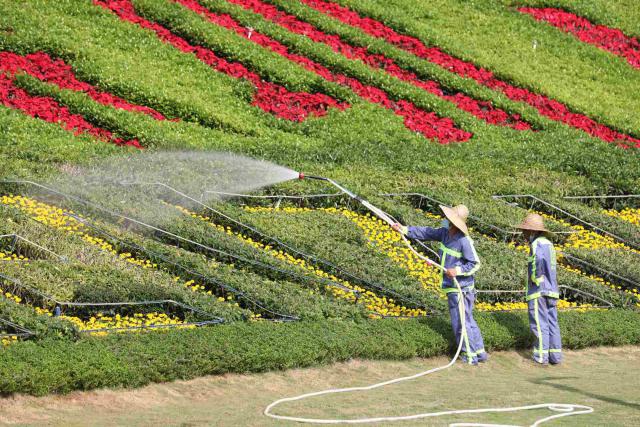 ▲公園里,戴著遮陽帽的工作人員忙著給花草"補(bǔ)水降溫"。