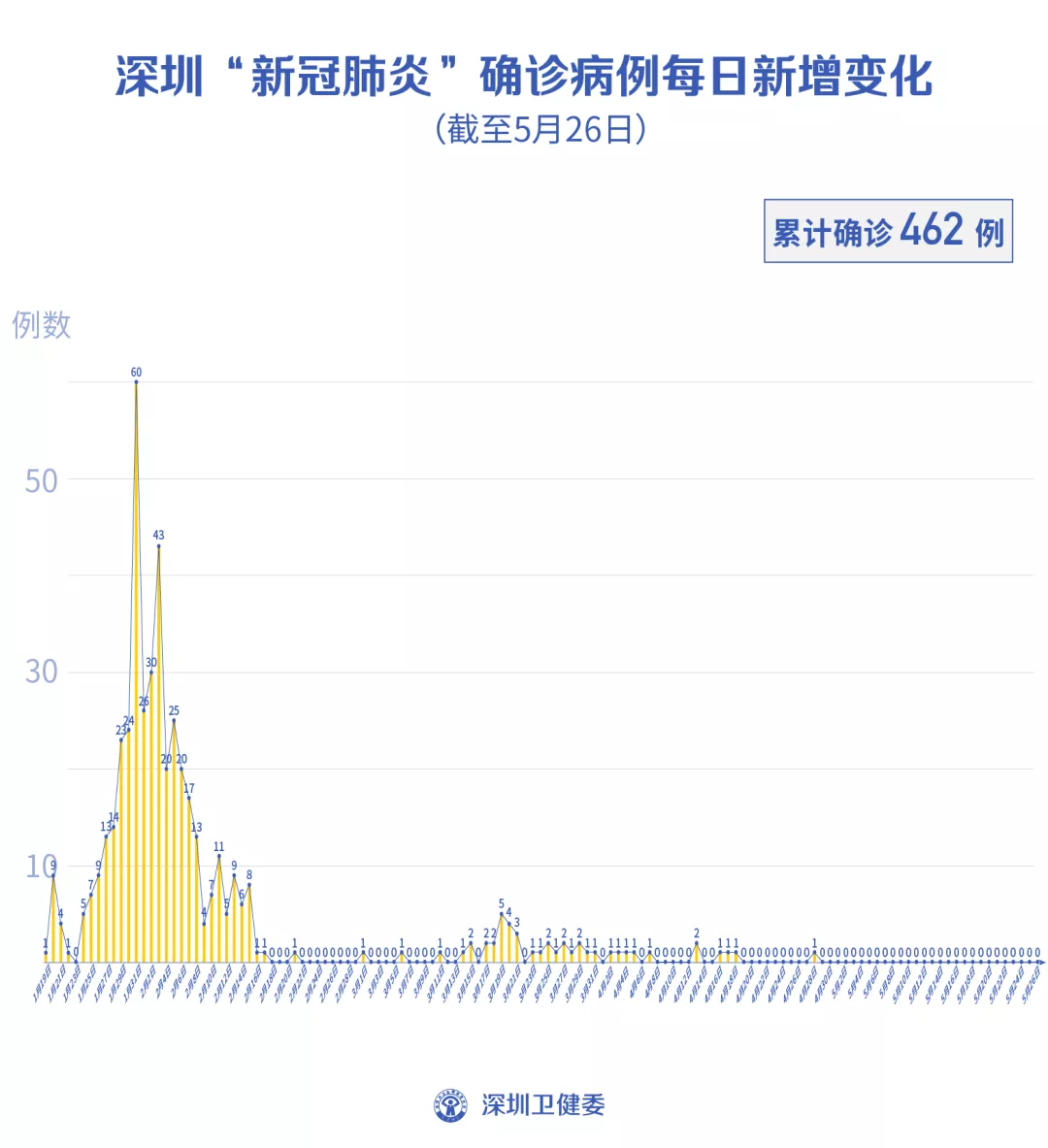 截至5月26日24時,深圳累計報告新冠肺炎病例462例。