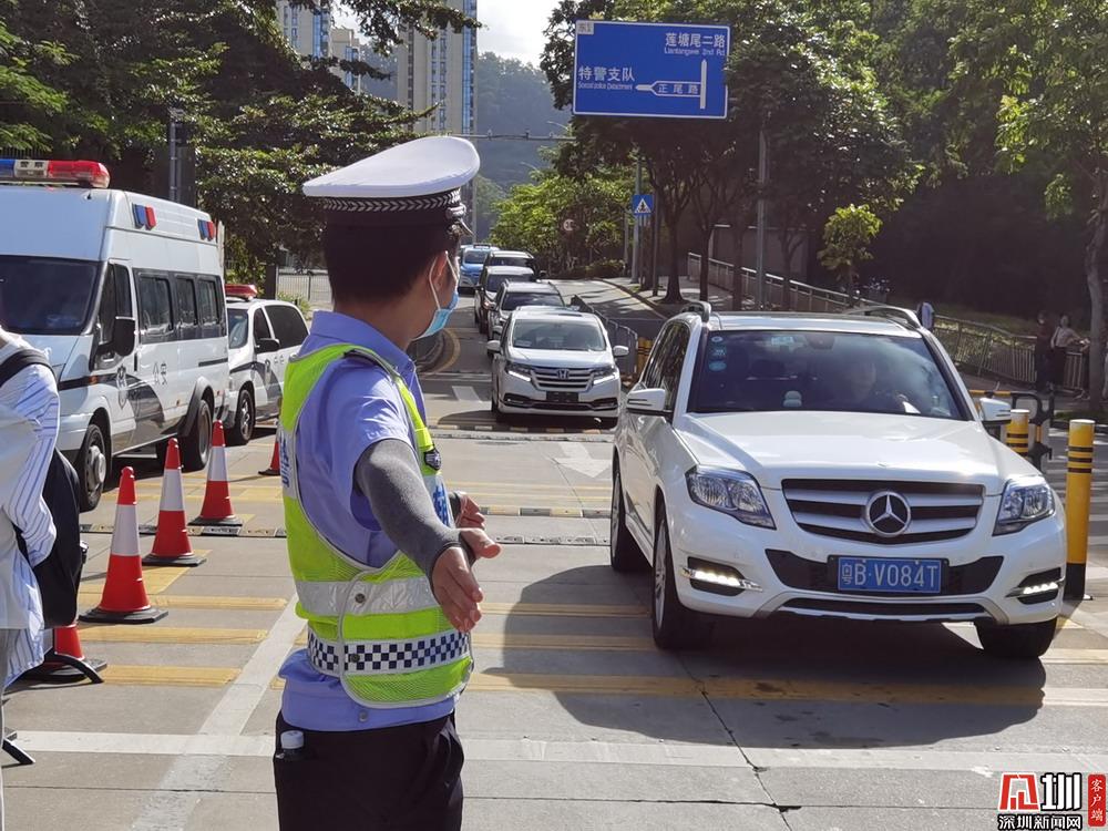 【紅嶺中學(xué)】考點門口正在指揮車輛通行的交警。