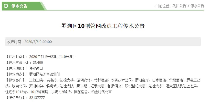 2020年7月9日23時至10日8時,羅湖區邊檢二院、羅湖金岸小區、邊檢大院一期二期、羅湖村9號樓、鉑金時代公寓等小區將停水9小時。