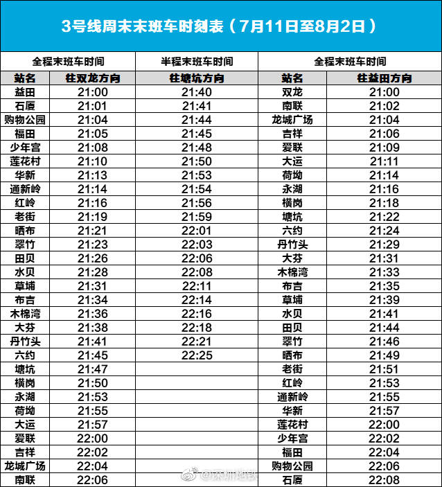 見圳客戶端?深圳新聞網2020年7月8日訊(見圳客戶端、深圳新聞網記者 陳致遠)記者從深圳地鐵了解到,為配合新線開通,7月11日至8月2日的每周六、周日,深圳地鐵3號線將于21時提前結束運營。其他地鐵線路正常運營。