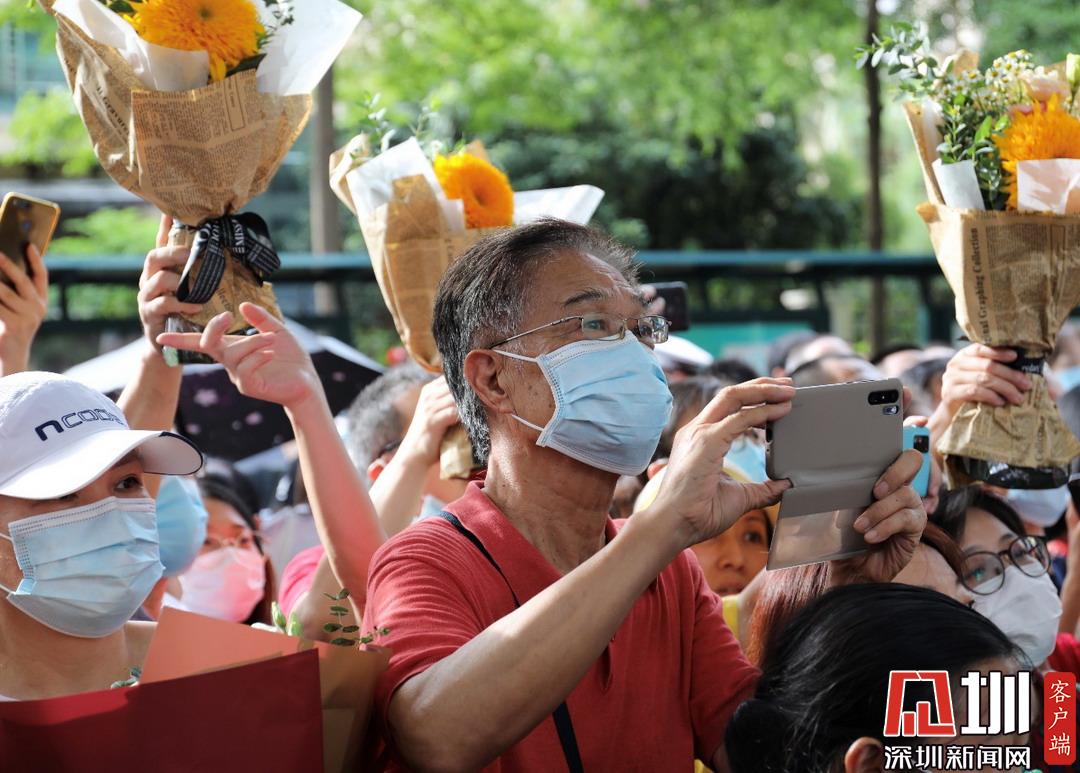 深圳高級中學考點外家長受捧鮮花、滿懷期待。