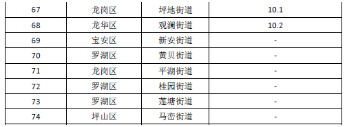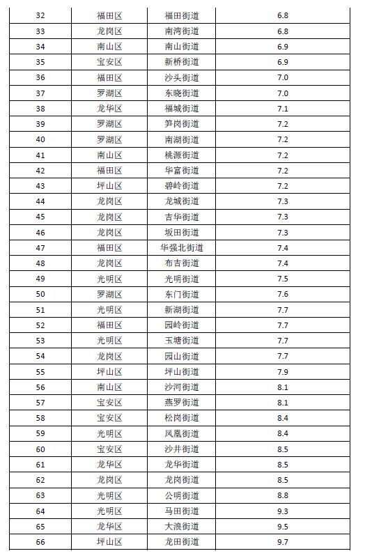 排名前十的街道是:福保街道、福海街道、海山街道、西鄉街道、南園街道、清水河街道、粵海街道、石巖街道、石井街道和蓮花街道;排名倒數后十的是:觀瀾街道、坪地街道、龍田街道、大浪街道、馬田街道、公明街道、龍崗街道、龍華街道、沙井街道和鳳凰街道。