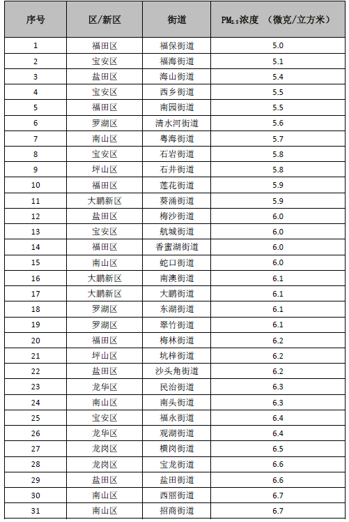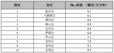 各區PM2.5平均濃度在6.1-8.3微克/立方米之間,濃度較低的有鹽田區、大鵬新區、福田區和南山區,濃度較高的有光明區、龍華區和龍崗區。