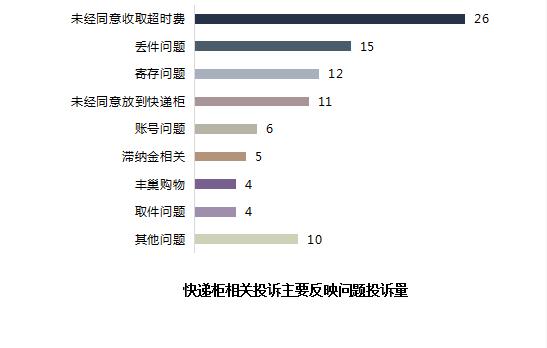 2020年上半年,深圳市消委會(huì)共收到93宗有關(guān)快遞柜的投訴,其中,深圳市豐巢科技有限公司(以下簡稱“豐巢”)相關(guān)投訴76宗,占快遞柜總投訴量的81.72%。主要反映未經(jīng)同意收取超時(shí)費(fèi)問題、丟件問題、寄存問題、未經(jīng)同意將快遞放到快遞柜等問題。