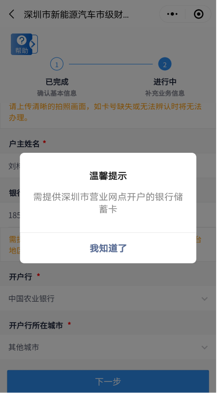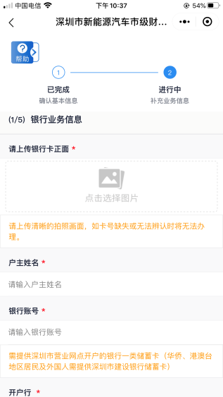 客戶需上傳銀行卡照片,并填寫銀行賬號、開戶行信息。開戶行如不在選項范圍內可選擇“其他”自填。其中,銀行賬號需為深圳市營業網點開戶的銀行一類儲蓄卡,華僑、港澳臺地區居民及外國人需提供深圳市建設銀行一類儲蓄卡。