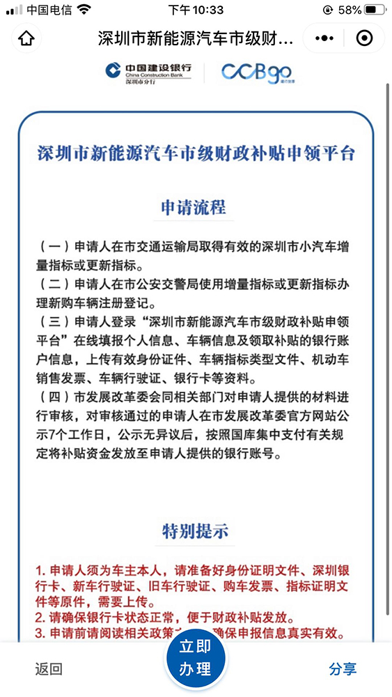 客戶可通過i深圳微信公眾號、深圳市發展和改革委員會官方網站或微信公眾號、深圳交警微信公眾號或建行到家CCBgo小程序登錄“深圳市新能源汽車市級財政補貼申領”平臺。