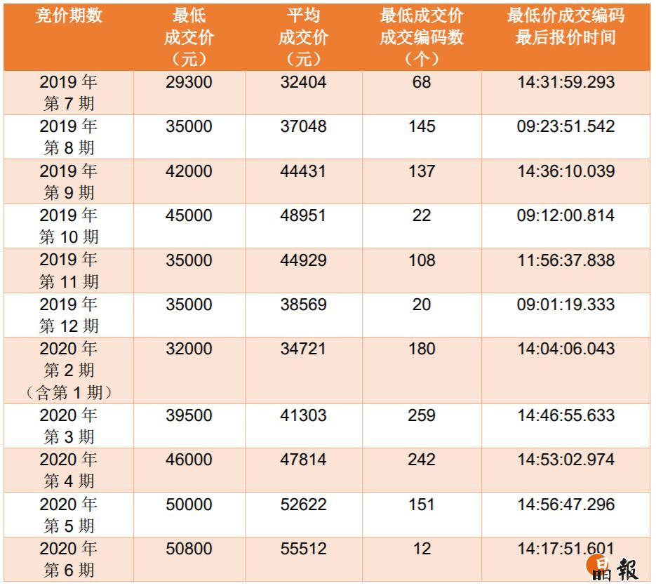 7月15日,2020年第7期普通小汽車增量指標競價公告發布,本期普通小汽車增量指標共3346個,其中個人指標2945個。競價時間定為7月27日9:00至15:00,連續進行6個小時,單位和個人在同一時間分別對相應增量指標進行競價。此前,第5期、第6期個人最低成交價均破5萬,創近一年新高。