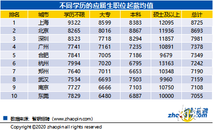 上海、北京、深圳、廣州這些一線城市的應屆生平均起薪相對較高。一般而言,在各城市中,隨著學歷的提高,應屆生起薪也會相應增加。但由于職業或行業的人才缺口較大,使得某些職位盡管學歷不限或僅要求大專學歷,但其薪酬卻相對較高。例如,上海有的職位學歷不限或要求大專以上,但起薪要高于本科崗位,這也間接反映出應屆生就業市場存在明顯的結構矛盾。
