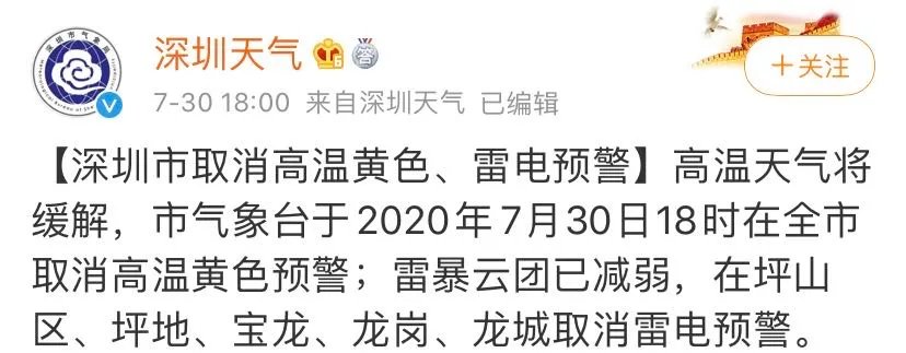 見圳客戶端·深圳新聞網2020年7月31日訊 7月30日18:00,深圳氣象臺取消了持續生效25天的高溫預警。
