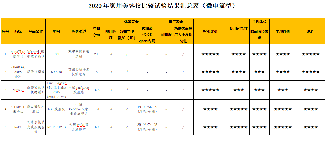 附:2020年家用美容儀比較試驗(yàn)結(jié)果匯總表(微電流型/電離子型)