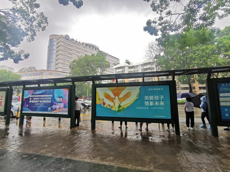 北大醫院公交站臺等車的乘客撐起了傘,穿好雨衣。(記者張玲 攝)