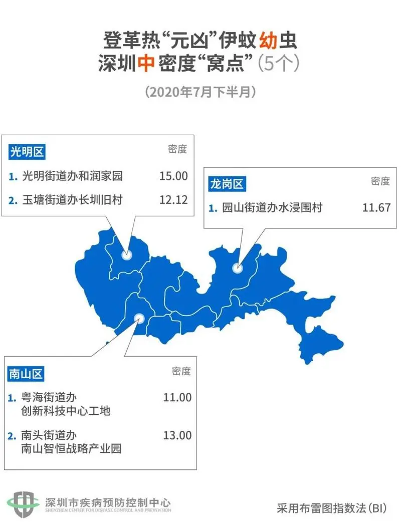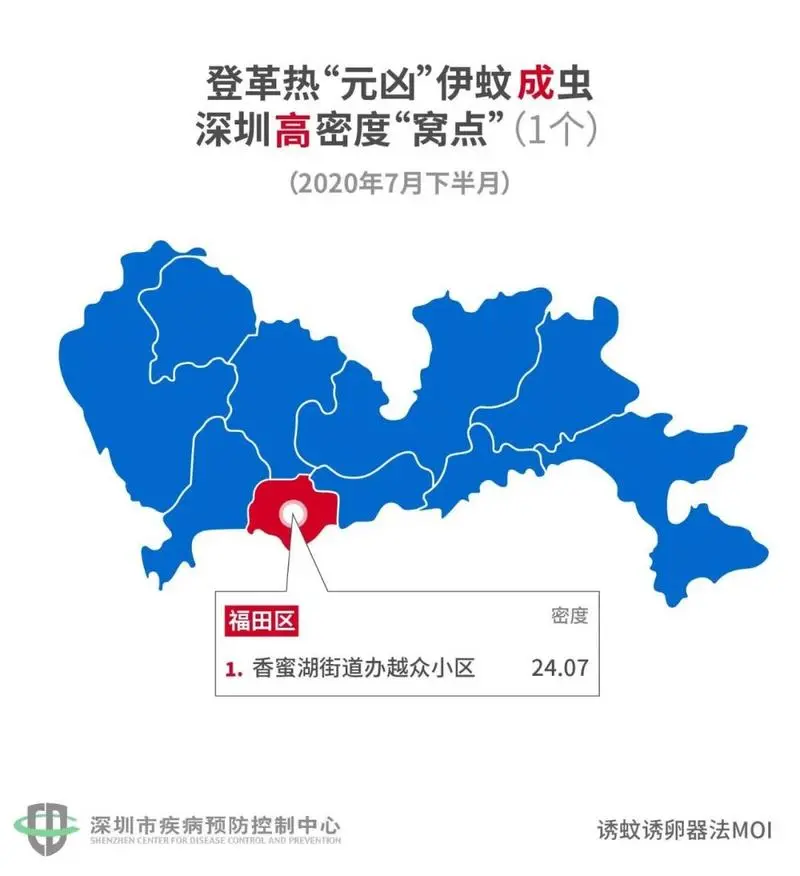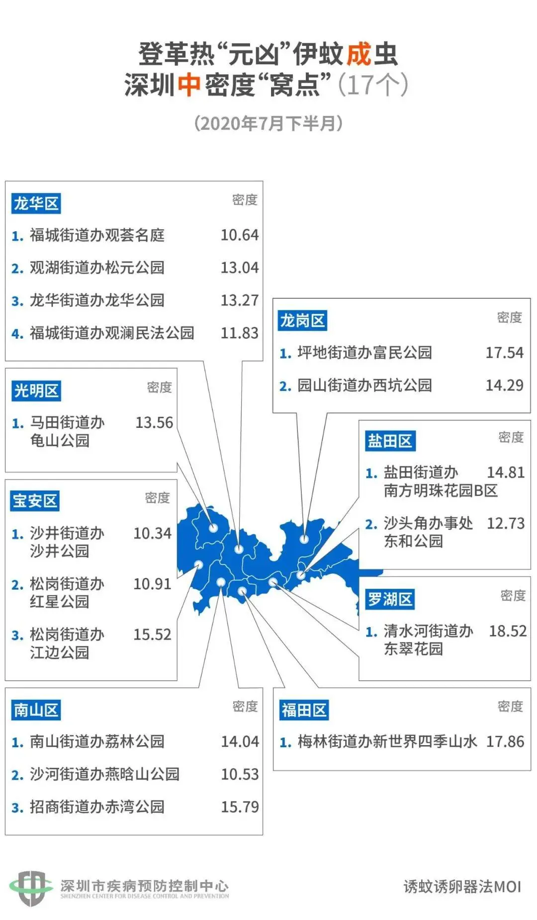 下面的伊蚊分布圖就是登革熱風險地圖。中密度說明有一定的登革熱傳播風險,高密度則意味著,一旦有外部病例輸入,就可能在周邊片區引發登革熱流行。