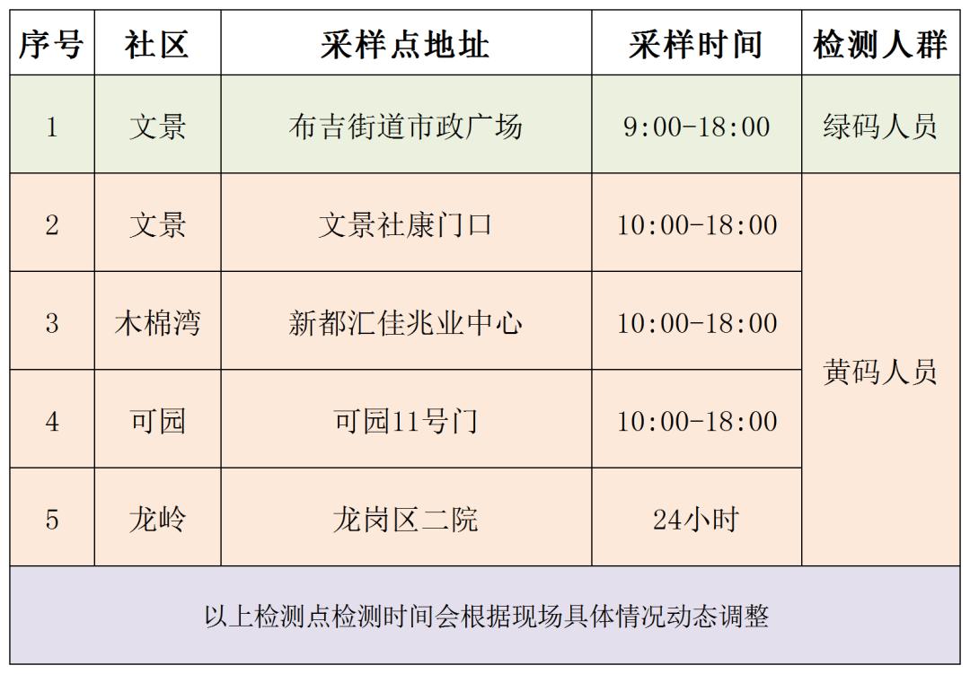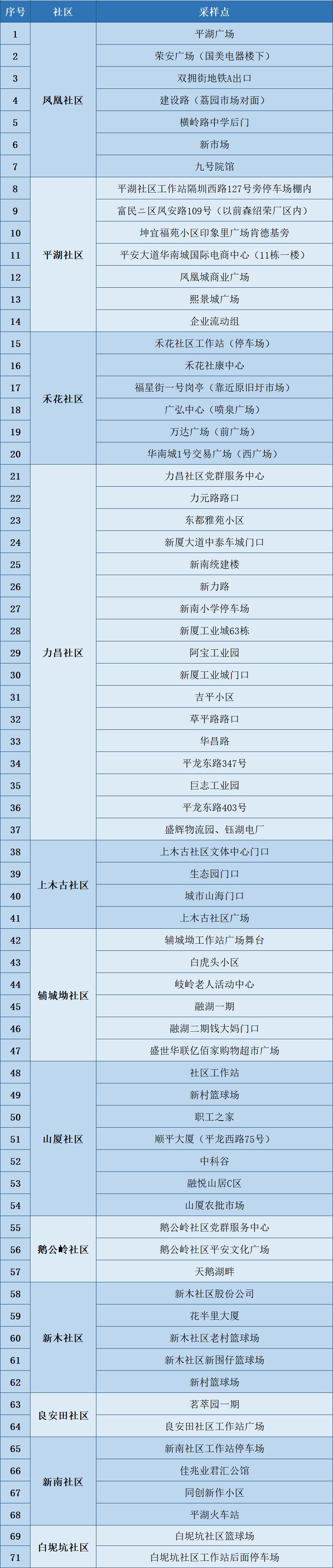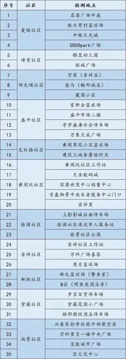 根據疫情防控需要,為最大程度保障人民群眾生命安全和身體健康,龍崗區各街道于1月10日開展新一輪免費核酸檢測以下點位統計截至1月10日。各點位動態更新請以社區通知及現場實際情況為準。