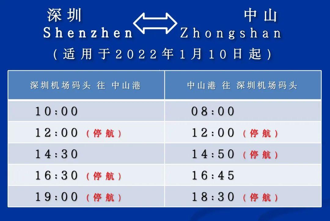 同時,1月10日起,深圳機場碼頭至中山港航線船班保留每日2進2出:10:00、14:30 深圳機場碼頭出發前往中山港;08:00、16:45 中山港出發前往深圳機場碼頭。