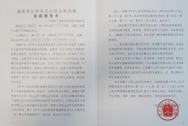 全國首份家庭教育令由長沙市天心區人民法院發出。