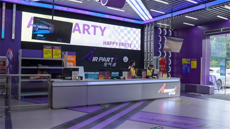 不遠處的AIR PARTY空氣湃則呈現出截然不同的景象。占地18000㎡的室內潮玩空間內,匯聚了“瘋狂的麥咭”密室、C919飛行模擬、AR競技等近百項體驗項目,每周更新玩法機制,成為年輕人釋放活力、親子家庭全天暢玩的熱門地標。
