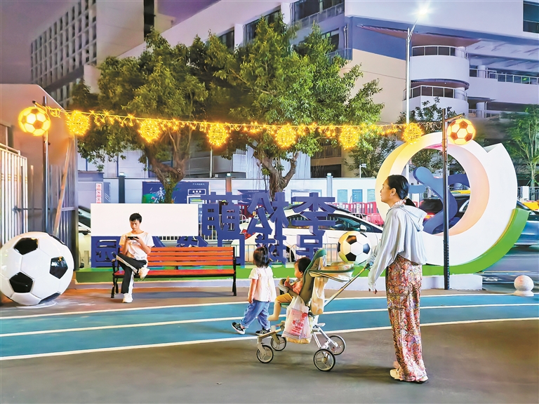 今年全運會足球賽事來到了家門口,讓這座有著600余年歷史的老村迎來蝶變。社區沿街的圍擋、箱體都巧妙地融入了足球元素,蓢新路的燈帶與發光字點亮夜空,讓這條老街成了“夜光打卡道”。“每盞燈籠都是我們親手掛的,三角梅有買來的‘心意花’,也有移植的‘用心苗’。”社區工作人員說,這些布置,藏著居民對賽事的期待。