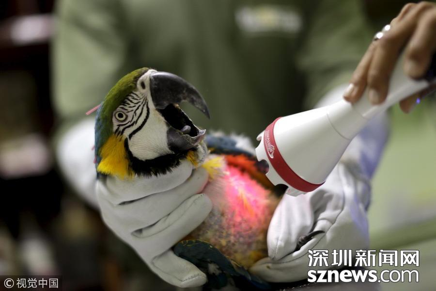 當地時間2015年7月30日,巴西巴西利亞,一只藍喉金剛鸚鵡正在接受激光治療。