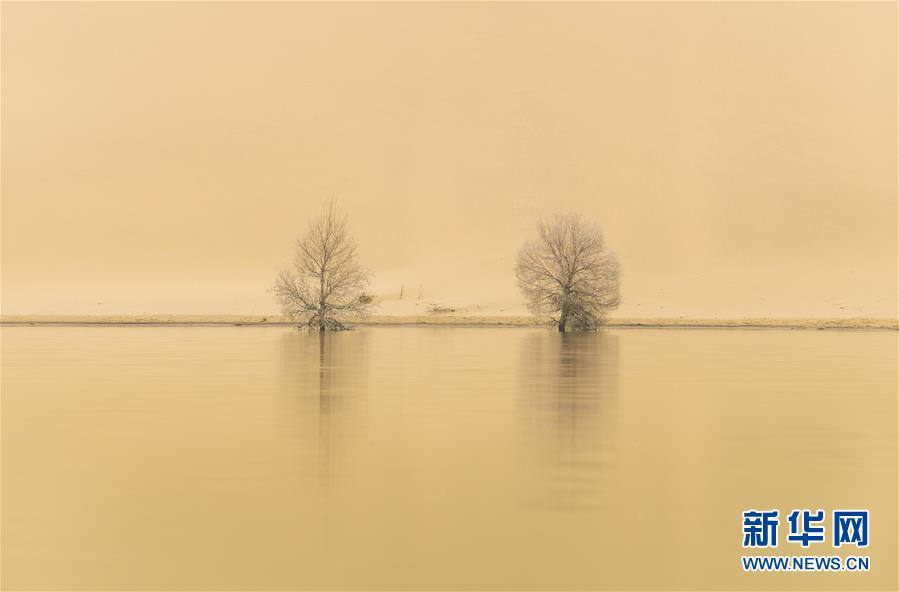 在位于新疆巴音郭楞蒙古自治州尉犁縣的一處名叫“羅布湖”的海子里,兩棵胡楊的倒影映在水中(10月17日攝)。 新華社記者 趙戈 攝