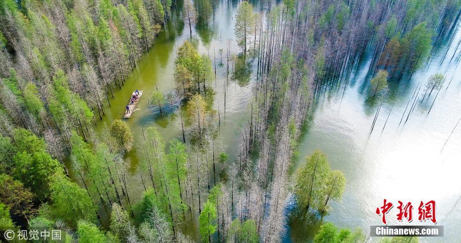 10月5日,航拍安徽宣城寧國方塘鄉汪村青龍湖港口灣水庫,游客們泛舟湖上,穿梭于紅杉林中,享受秋日的美好時光。 圖片來源:視覺中國
