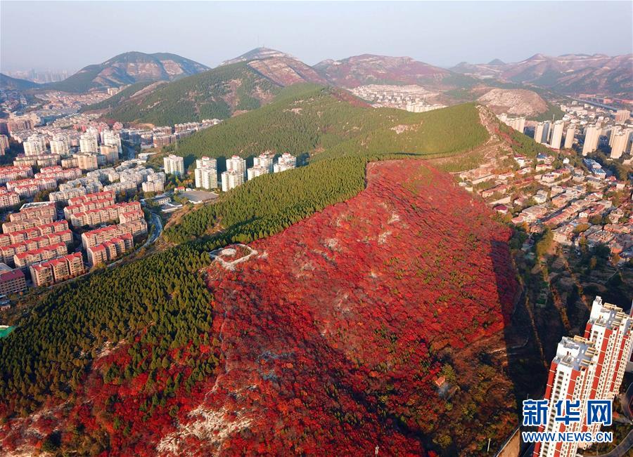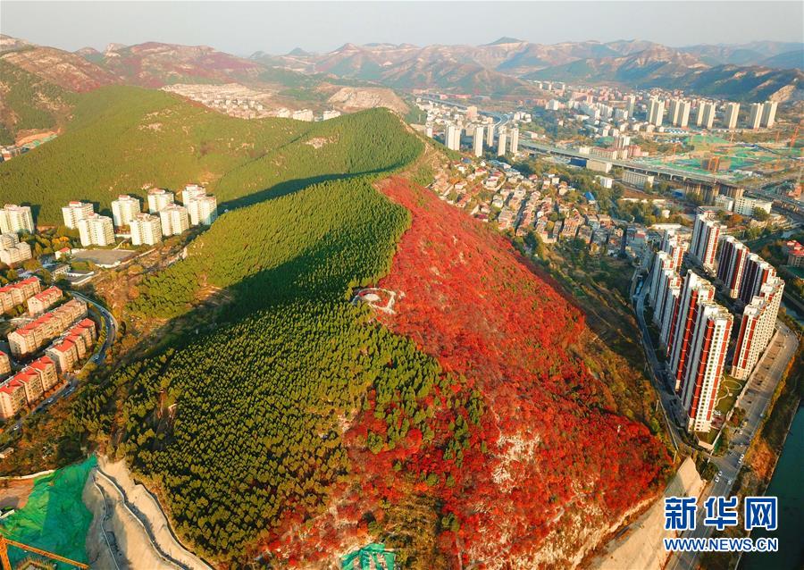 深秋時節,山東濟南楔子山山脊兩邊種植的植被形成“一山雙色”景觀,令人稱奇。