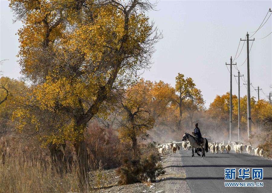 在新疆尉犁縣喀爾曲尕鄉,牧羊人馬木提·買買提在胡楊邊上的道路上牧羊(10月25日攝)。 10月中下旬,靜靜的塔里木河中下游一片金黃。胡楊深處,條條小路蜿蜒綿長通向遠方,引人入勝。 塔里木河是中國最長的內陸河,這一區域原始胡楊林分布較為集中。隨著塔里木河連續19次向下游生態輸水,為胡楊林“解渴”,塔河兩岸生態得到明顯改善,沙地面積逐年減少。 新華社記者趙戈攝