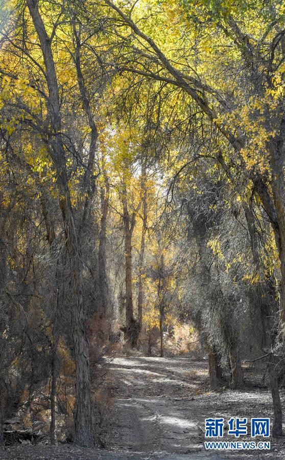 新疆尉犁縣胡楊林深處的一條小路(10月25日攝)。 10月中下旬,靜靜的塔里木河中下游一片金黃。胡楊深處,條條小路蜿蜒綿長通向遠方,引人入勝。 塔里木河是中國最長的內陸河,這一區域原始胡楊林分布較為集中。隨著塔里木河連續19次向下游生態輸水,為胡楊林“解渴”,塔河兩岸生態得到明顯改善,沙地面積逐年減少。 新華社記者趙戈攝